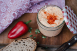 Bio Topfenaufstrich Paprika, 200g, aus unpasteurisiertem Bio- Heumilch- Magertopfen verfeinert mit Zwiebel, Salz und Paprika, Gebinde: Mehrwegglas