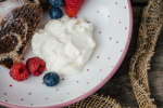 Bio Fruchtjoghurt Waldbeer, mind. 3,6 % Fett, aus erhitzter Bio- Heumilch. Gebinde: Mehrwegglas.